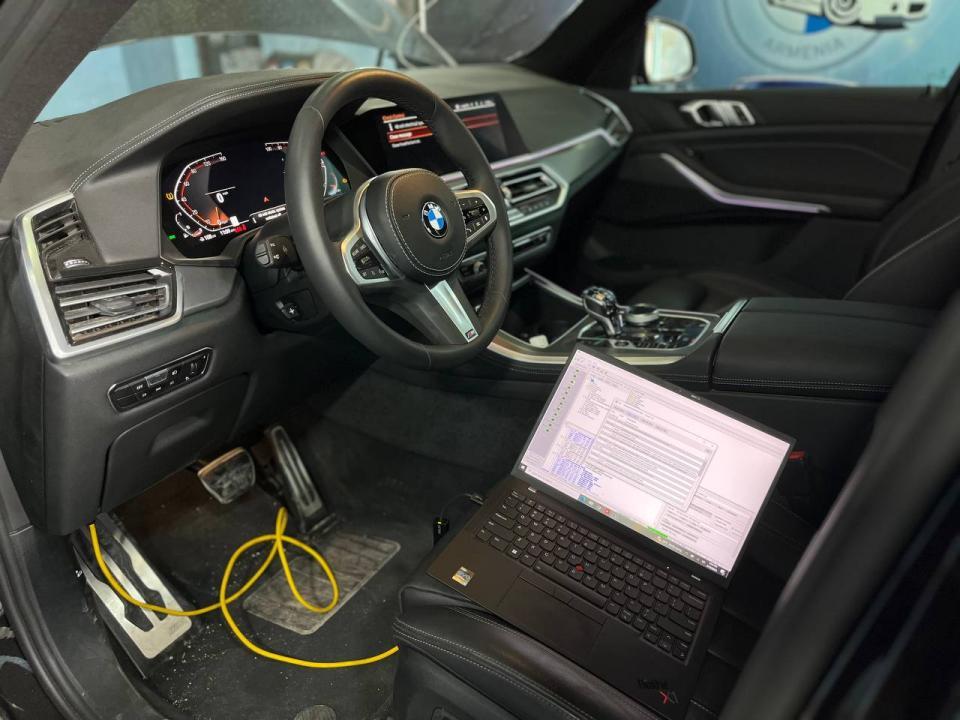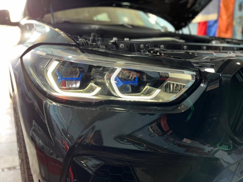 Вместо стоковых светодиодных передних фар установлены адаптивные светотехнические блоки BMW Laser Light, проще говоря, лазерные фары. Лазерно-люминофорная оптика, ее дальность освещения до 500-600 метров